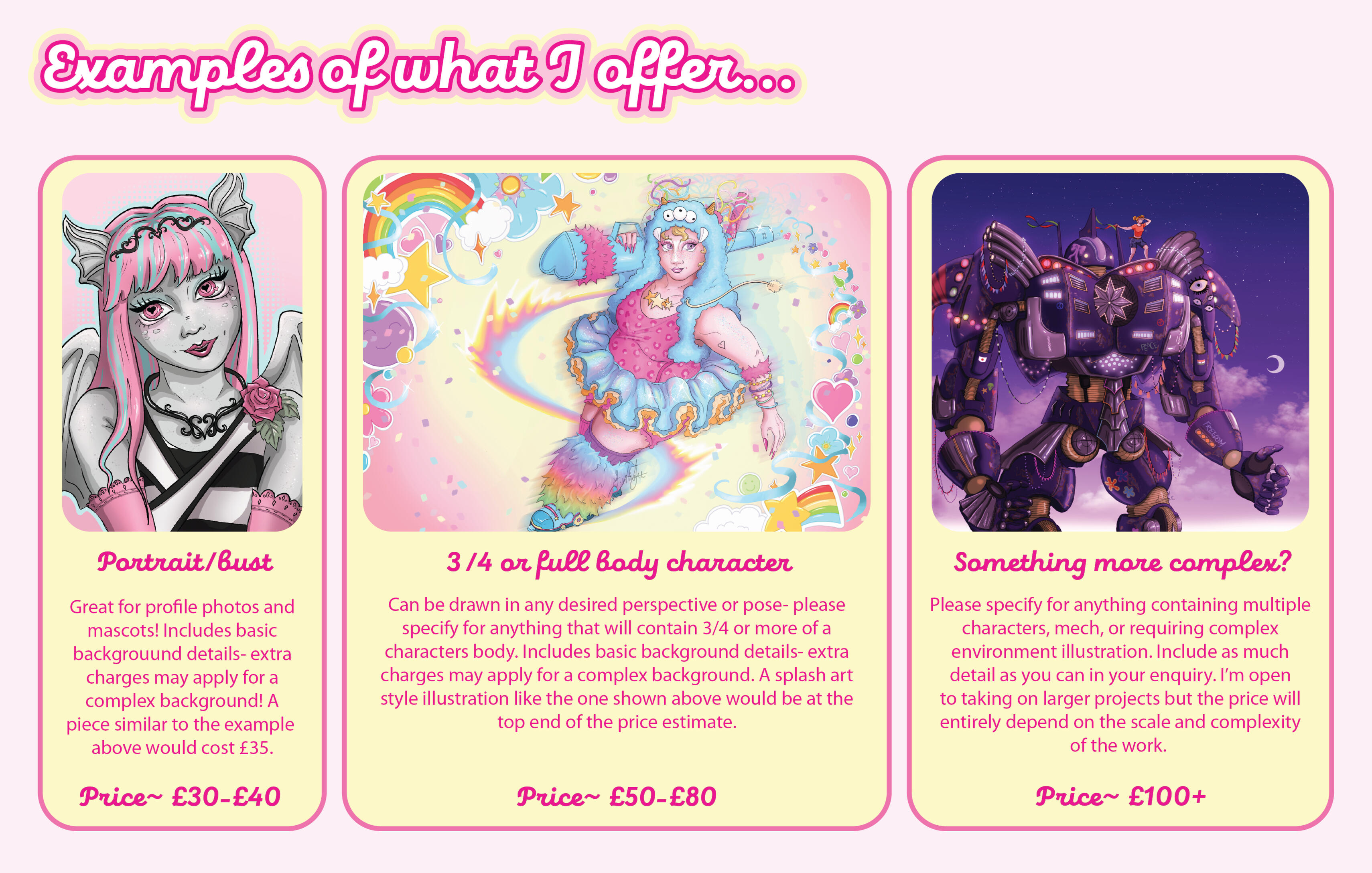 If you'd like something entirely custom made by me, you can commission me for as little as £30! I handle all commissions via email and take half of the payment upfront (once we have agreed on a price), and half once the piece is finished. Use the form below to enquire about a commission and I'll provide you with a quote. Or, just email me at [email protected]